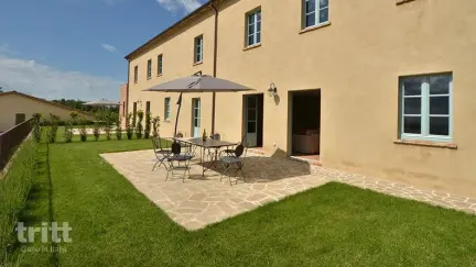 Dit ruime 6-persoonsappartement combineert comfort met Toscaanse charme en is verdeeld over meerdere verdiepingen. De begane grond heeft een lichte woonkamer met zithoek, open haard en satelliet tv, een eethoek en een goed uitgeruste keuken. Er zijn drie slaapkamers: twee met een tweepersoonsbed, waarvan één met eigen badkamer, en één met twee eenpersoonsbedden. Daarnaast zijn er nog twee badkamers met douche en haardroger. Op de verdieping bevindt zich een extra slaapkamer met tweepersoonsbed en aangrenzende privébadkamer met bad. Buiten biedt een ruim terras met grasveldje en tuinmeubilair volop gelegenheid om van de zon en het uitzicht te genieten. Het resort beschikt over een hoger gelegen zoutwaterzwembad omringd door ligstoelen en schaduwrijke plekken, met panoramisch uitzicht over de Val d’Orcia.
