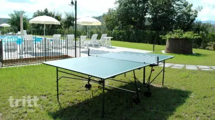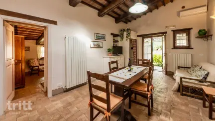 Dit ruime 8-persoons appartement ligt aan de overzijde van de weg, maar heeft directe toegang tot alle faciliteiten van de agriturismo. Binnen vind je een lichte woonkamer met slaapbank en eethoek, een open keuken en een praktische wasruimte. Het appartement beschikt over 3 slaapkamers en 2 badkamers. Buiten wacht een privéterras met tuinmeubilair en een eigen stenen barbecue, ideaal voor lange zomeravonden. Op het terrein zijn een zoutwaterzwembad met jacuzzihoek, speeltoestellen, sportfaciliteiten en een gezamenlijke barbecue. In het hoogseizoen worden kooklessen gegeven en mountainbikes zijn te huur.