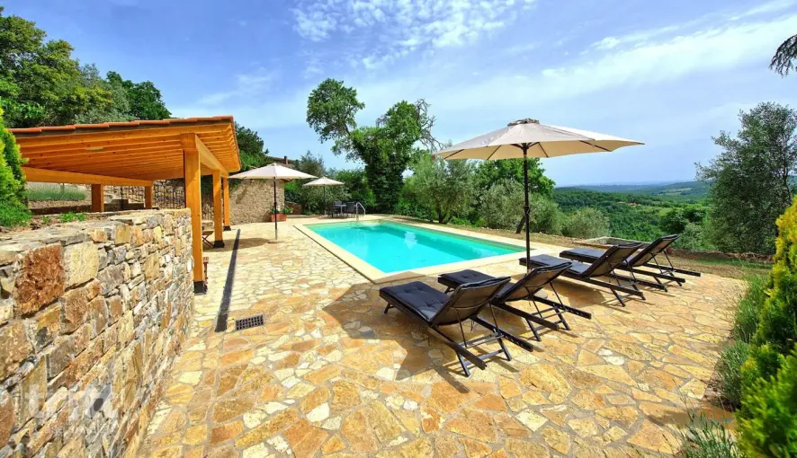 Dit vakantiehuis biedt plaats aan 12 personen en is verdeeld over 3 verdiepingen, waardoor iedereen voldoende ruimte en privacy heeft. De inrichting is eigentijds en comfortabel, met meerdere woonkamers, een grote woonkeuken en in totaal 6 slaapkamers. Een deel van de slaapkamers is voorzien van airconditioning, wat prettig is tijdens warme zomerdagen. Buiten ligt het privézwembad iets lager in de tuin, bereikbaar via een trap, met een prachtig uitzicht over de heuvels. Rondom het zwembad en onder de ruime veranda zijn fijne plekken om te ontspannen in zon of schaduw. Extra bijzonder zijn het grote terras op de verdieping en het dakterras, waar je tot in de avond kunt genieten van het landschap en lange diners in de buitenlucht.